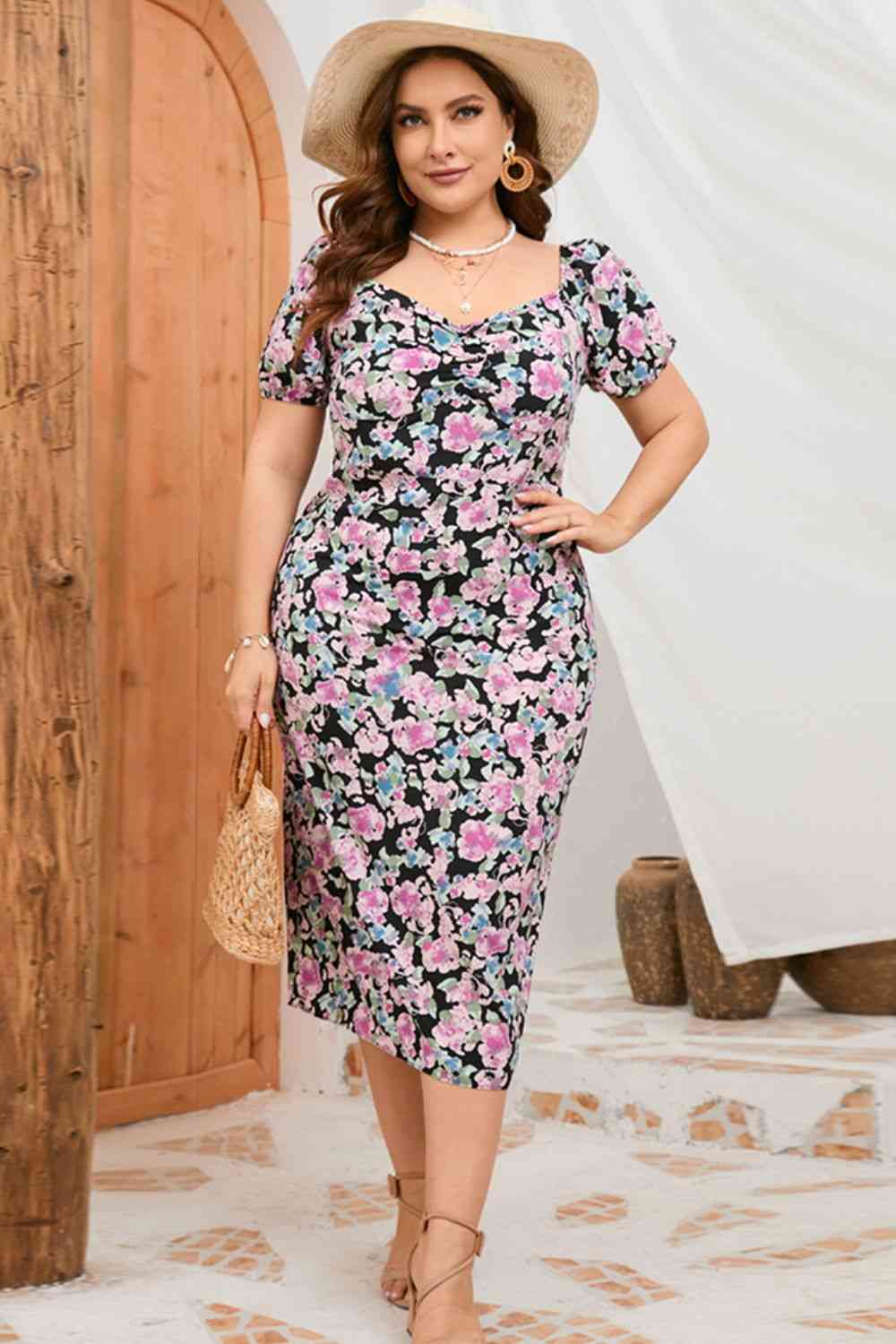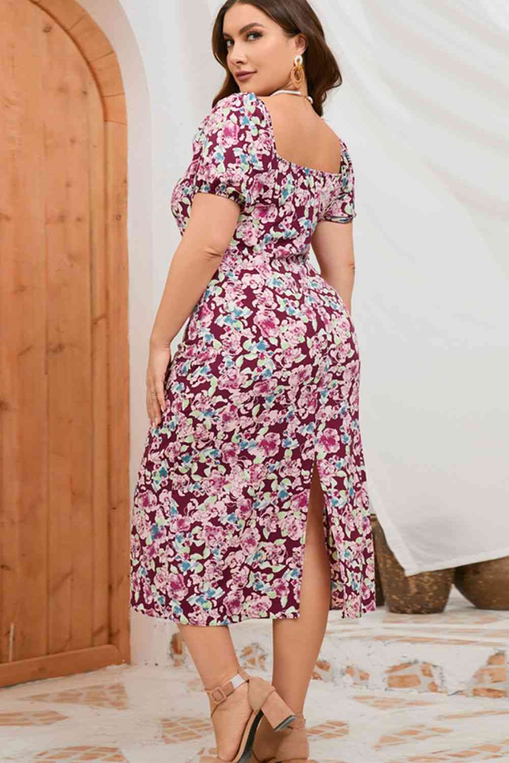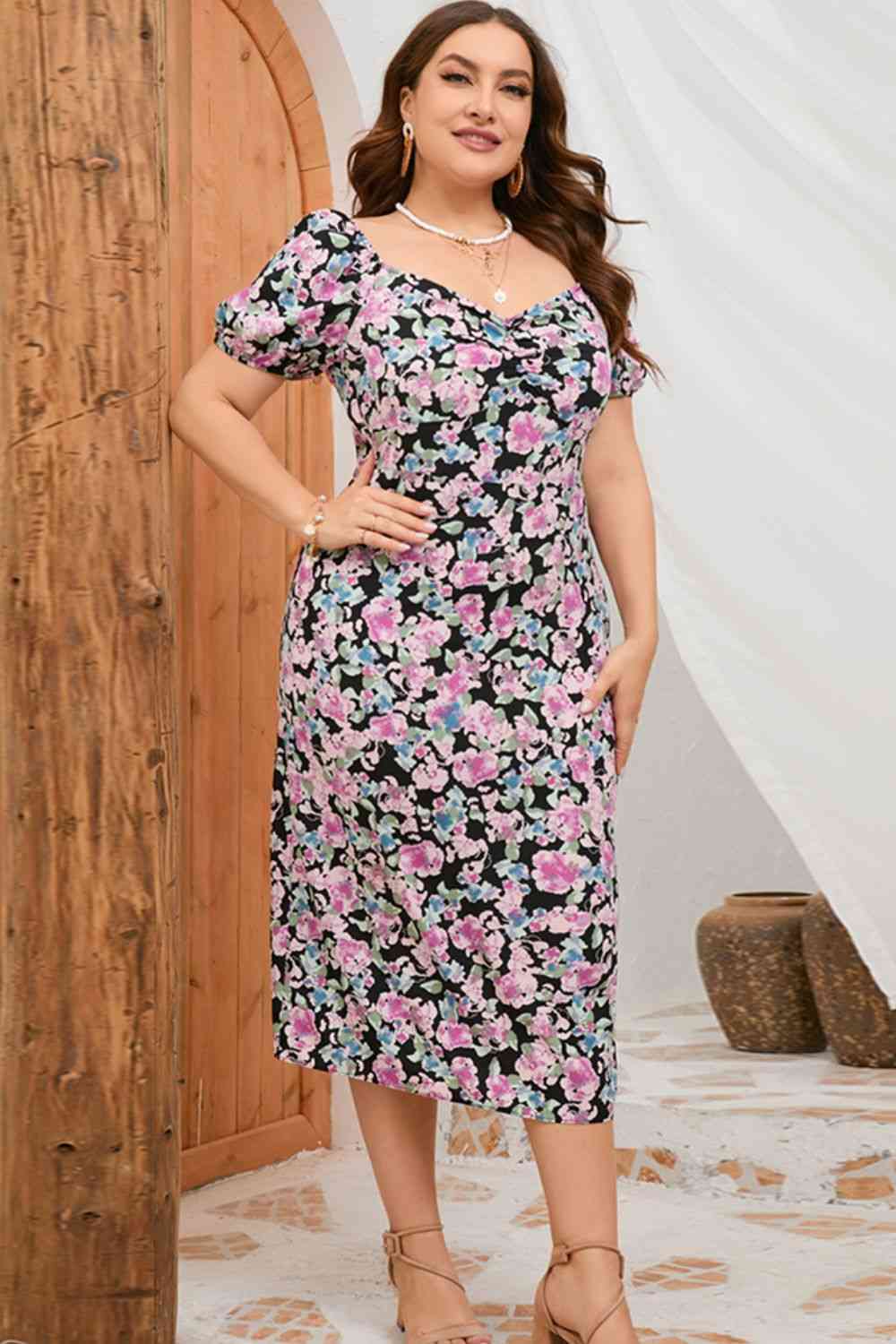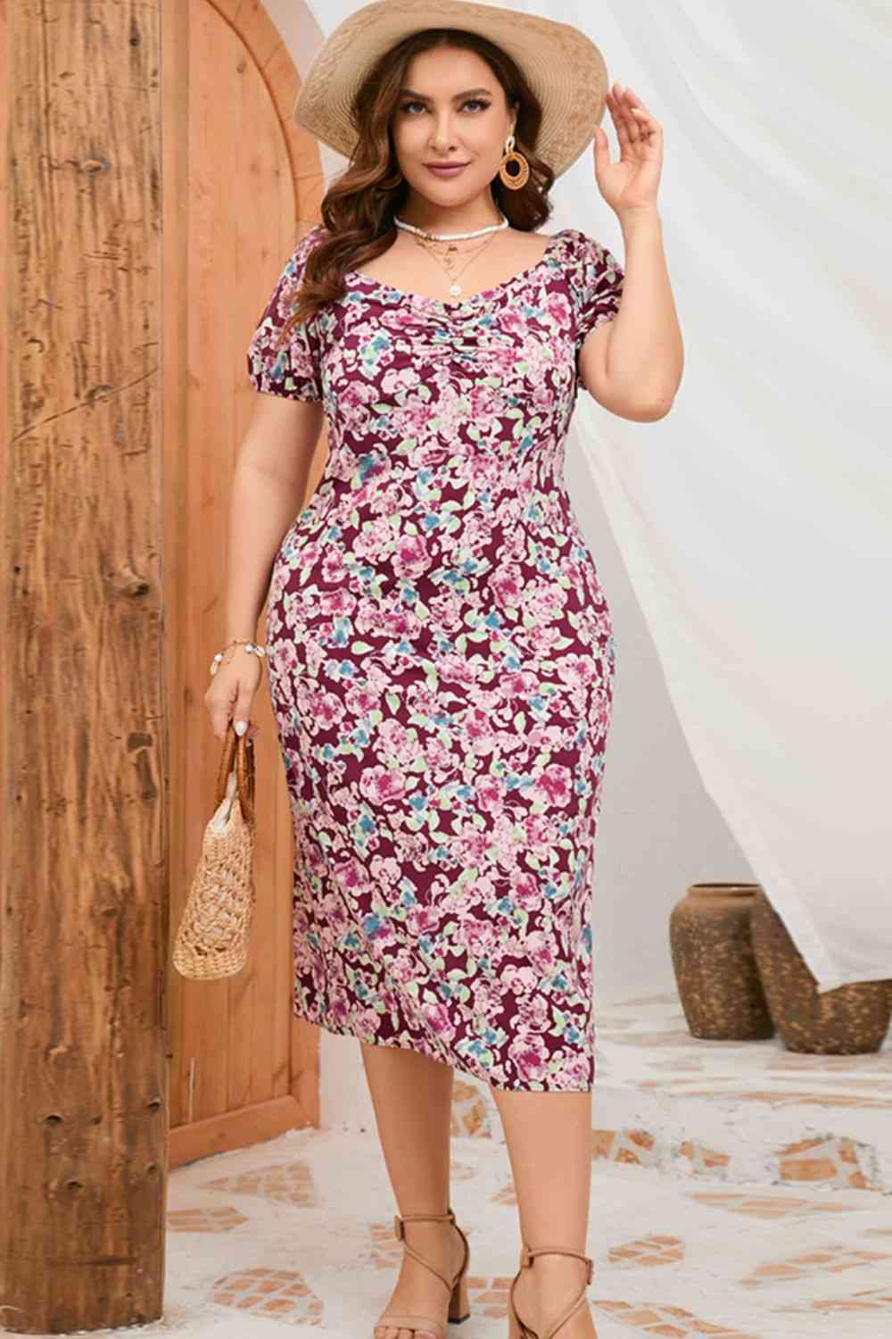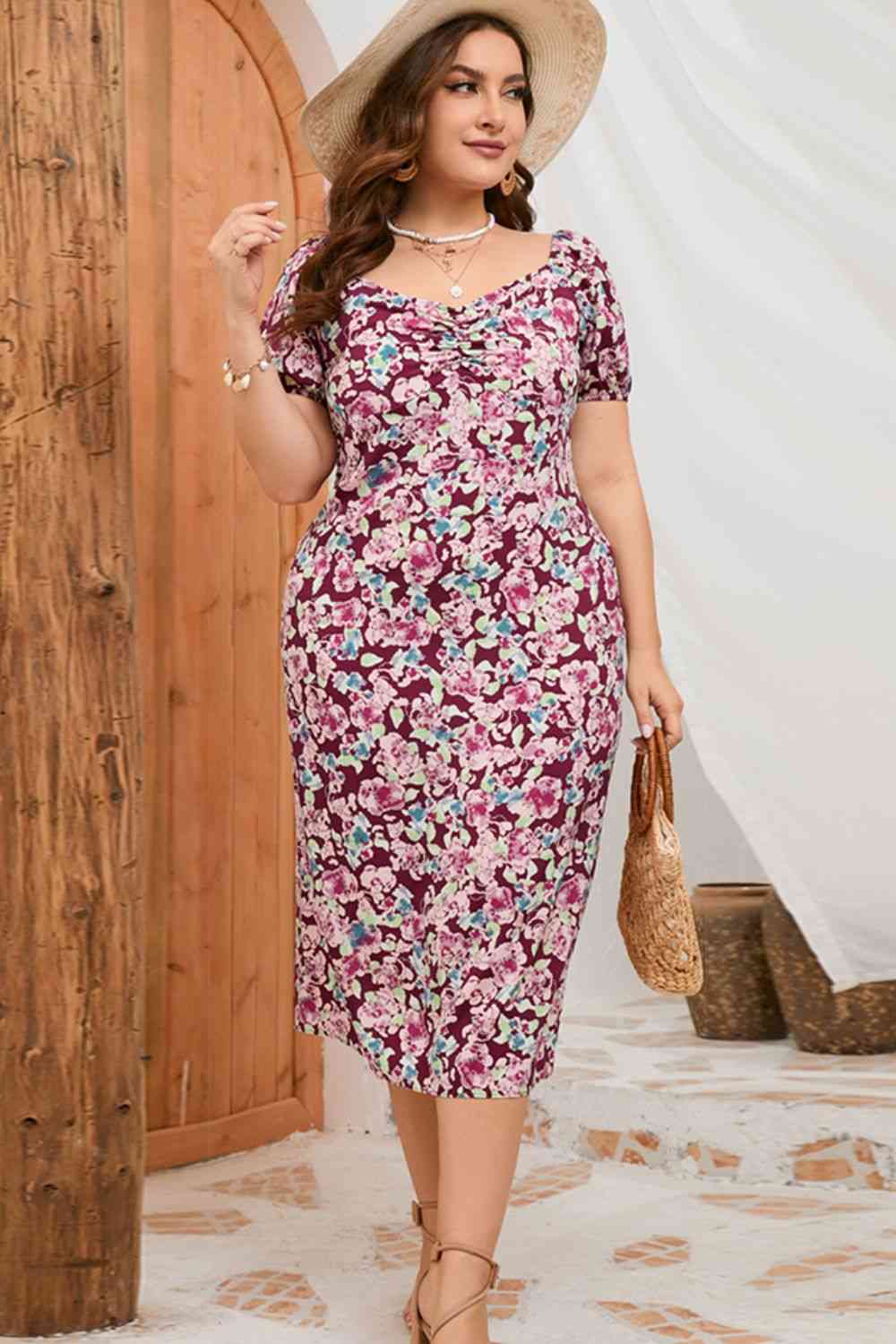 Plus Size Floral Ruched Slit Midi Dress
