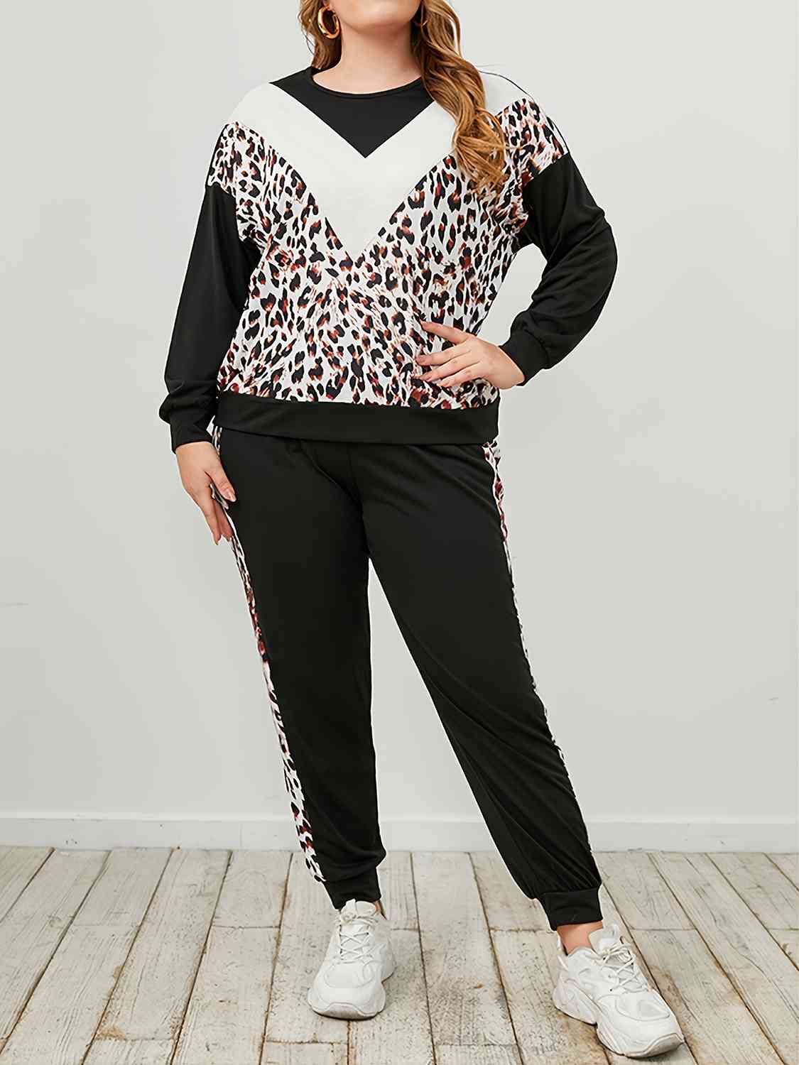 Plus Size Leopard Sweatshirt and Sweatpants Set