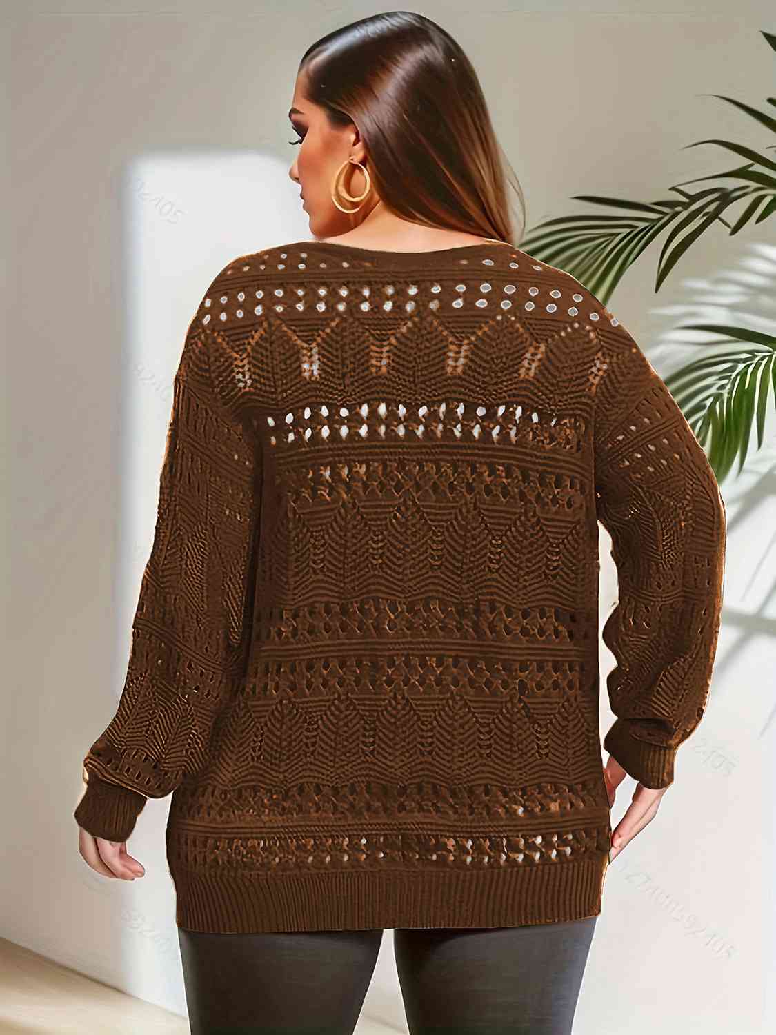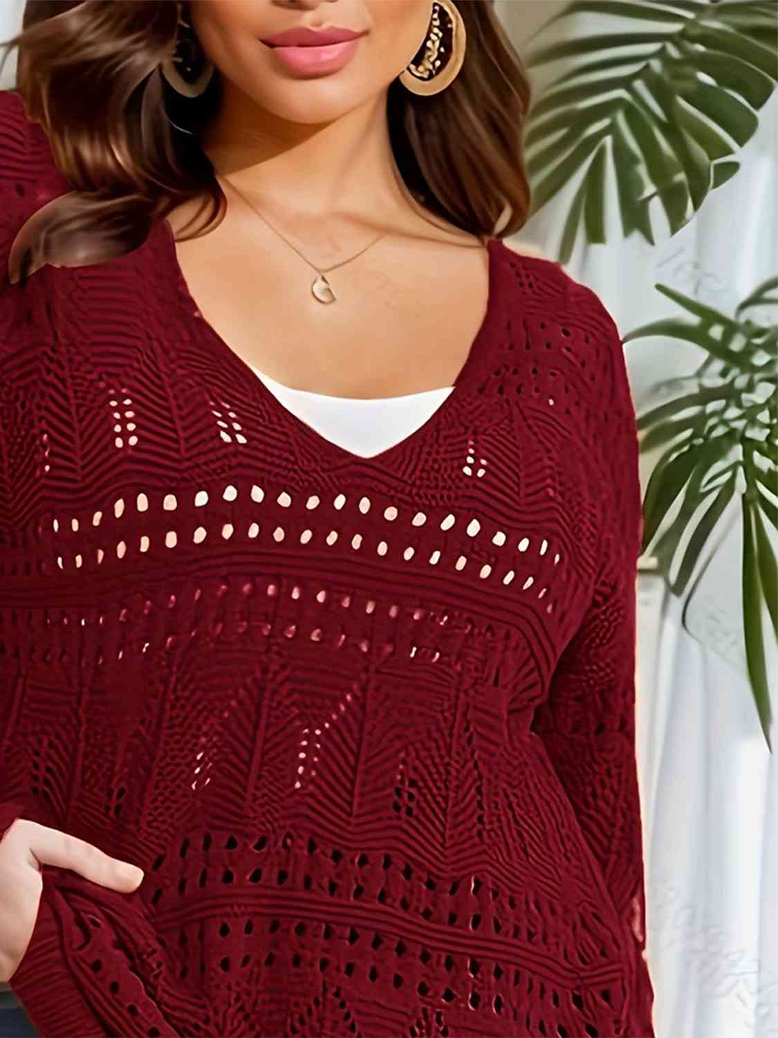 Plus Size Openwork Plunge Long Sleeve Sweater