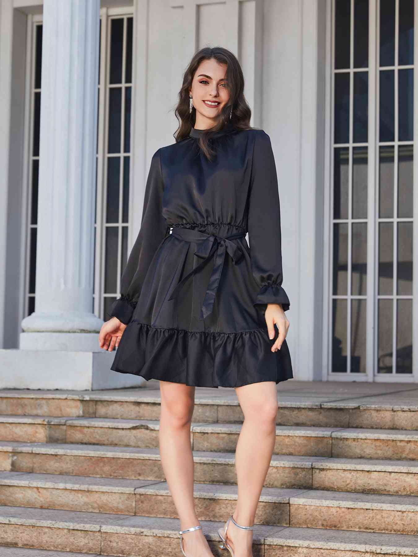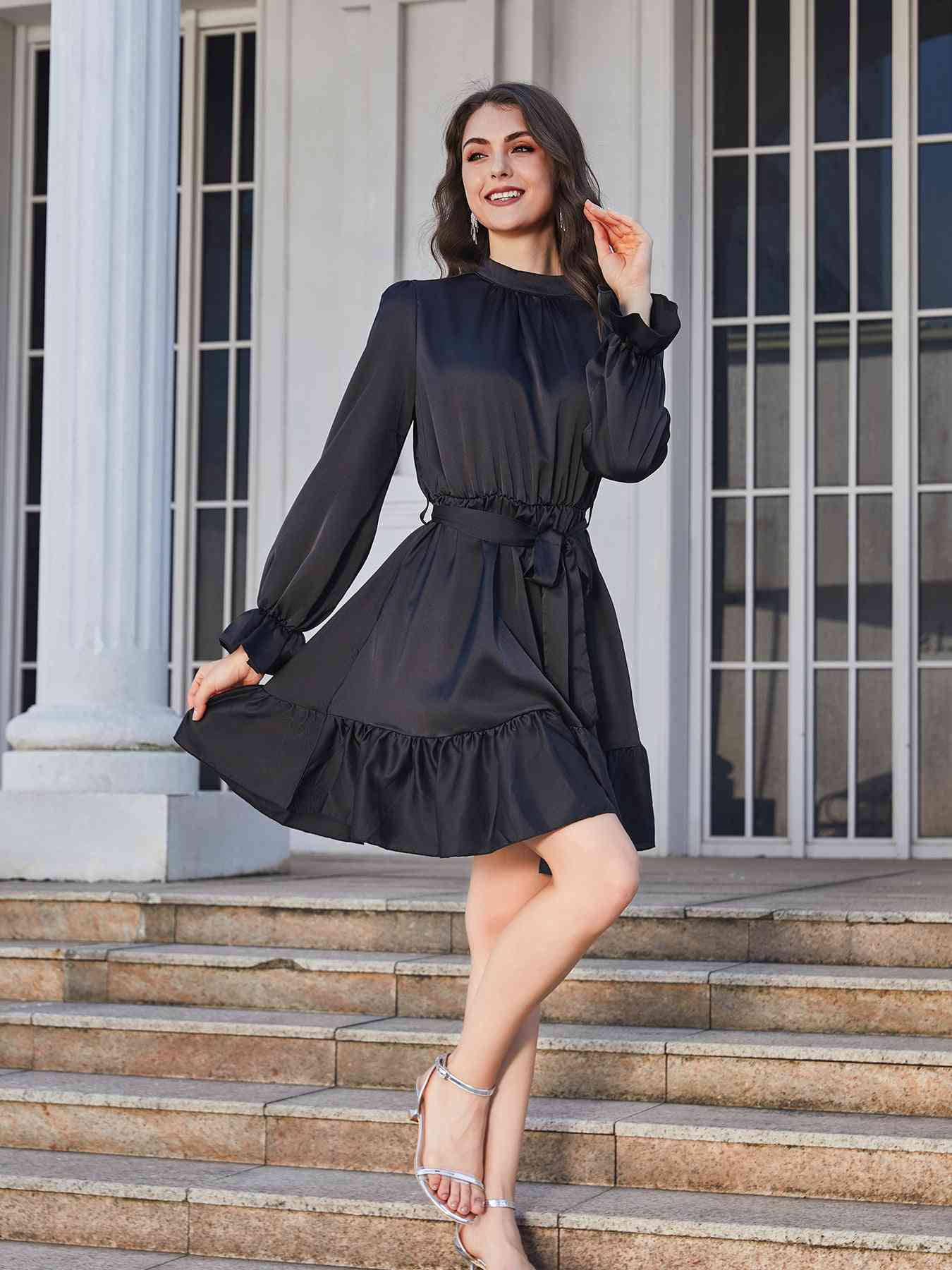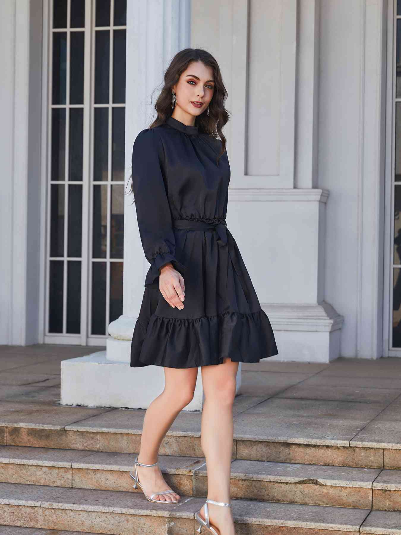 Ruffle Hem Tie Belt Mock Neck Knee Length Dress