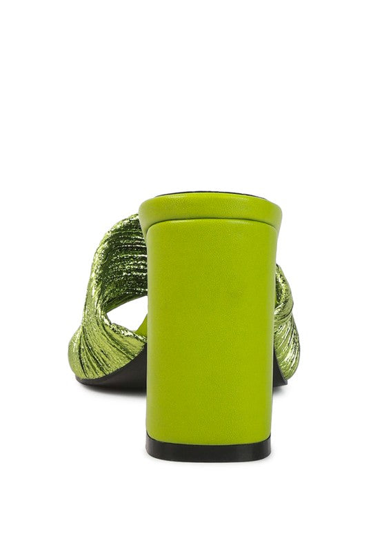 High Heel blocked Sandal with crinkled statement pu. The textured metallic strap adds weight to the look and makes you party-ready. The sandal comes with light cushioning which cuts strain.