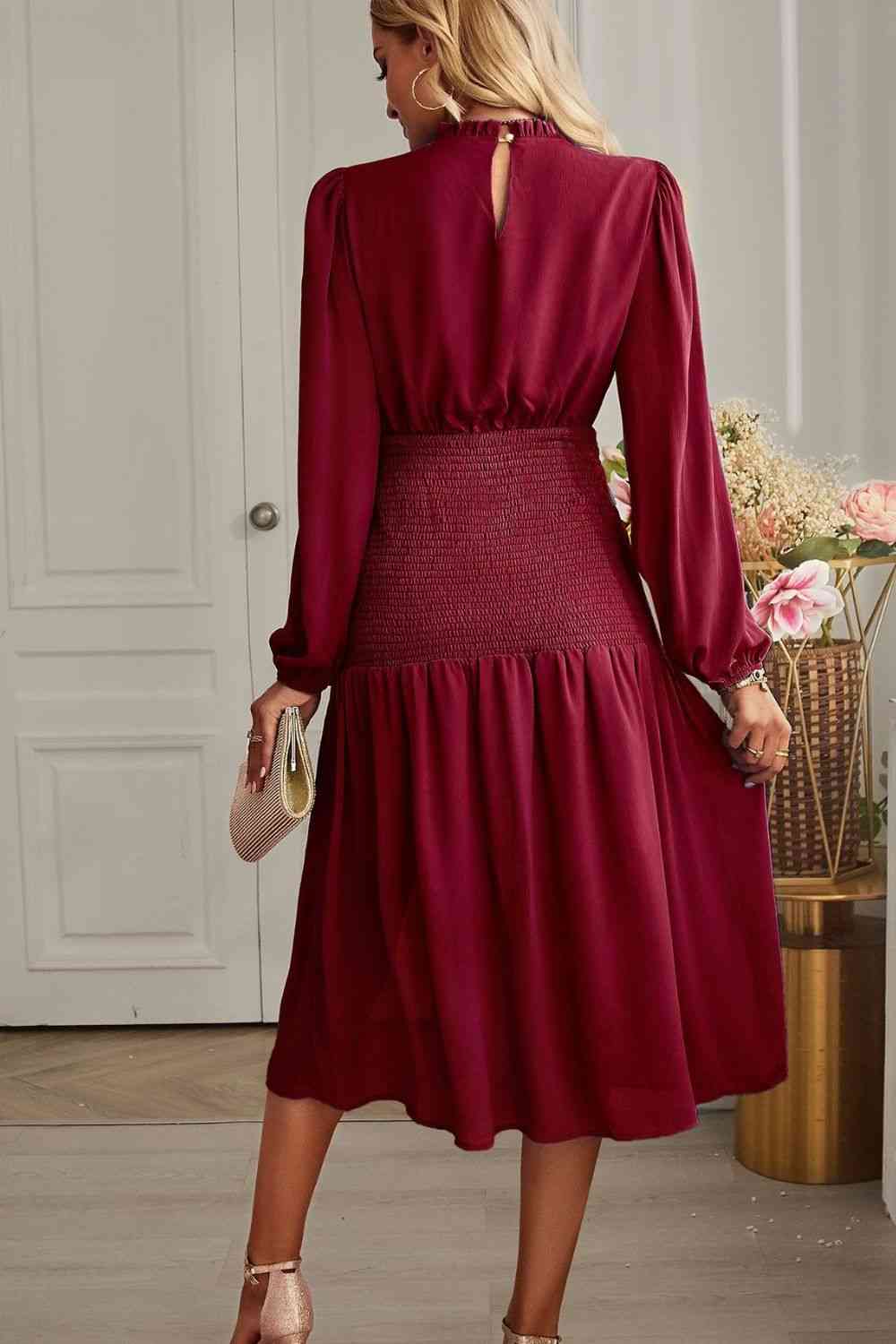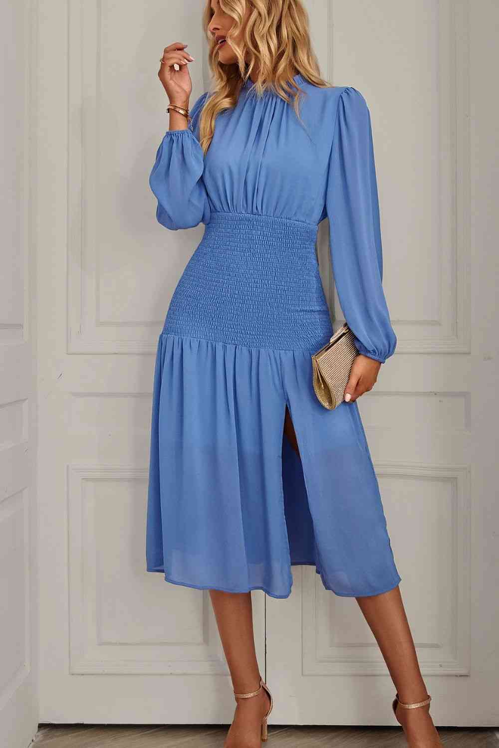 Slit Smocked Mock Neck Puff Sleeve Midi Dress