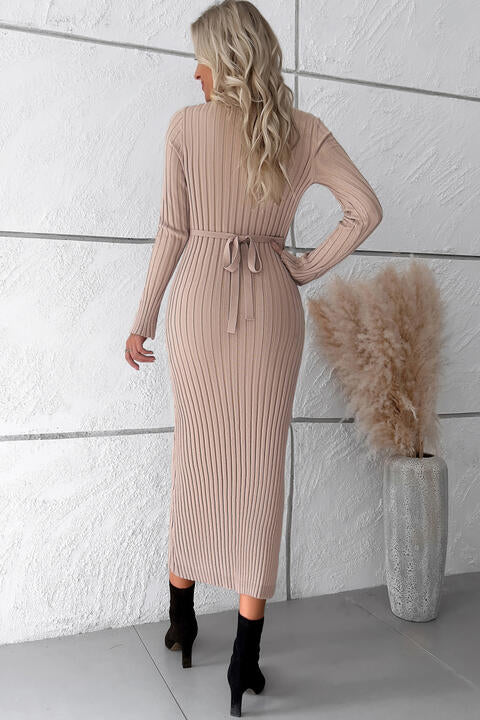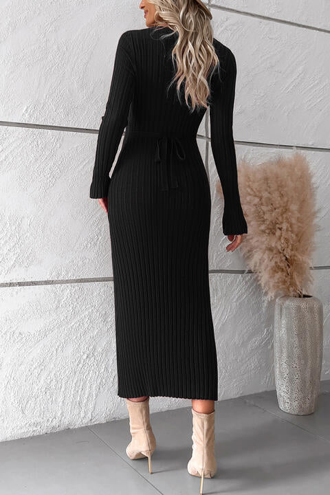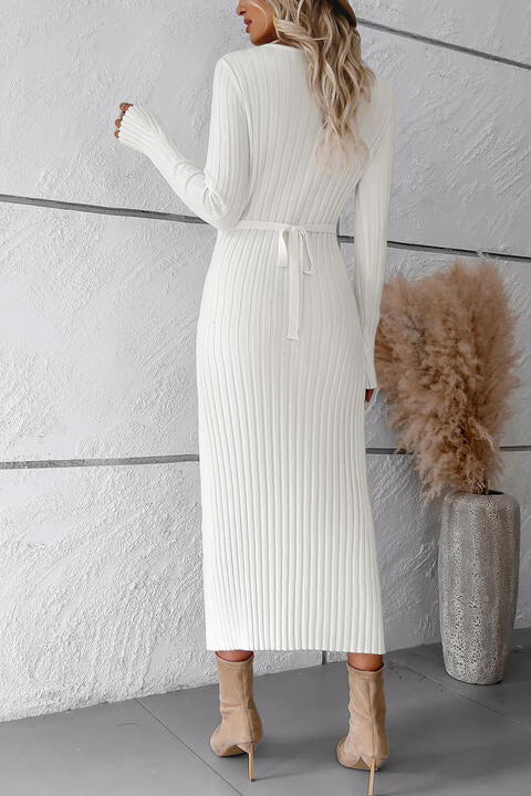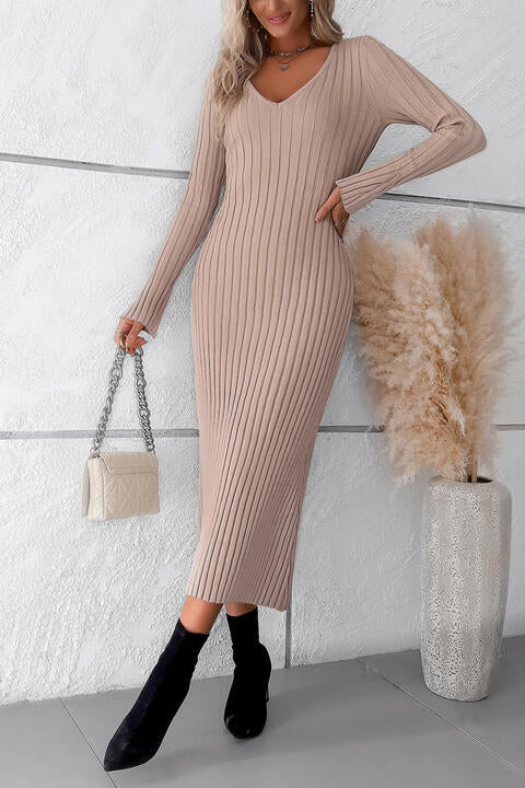V-Neck Long Sleeve Ribbed Sweater Dress